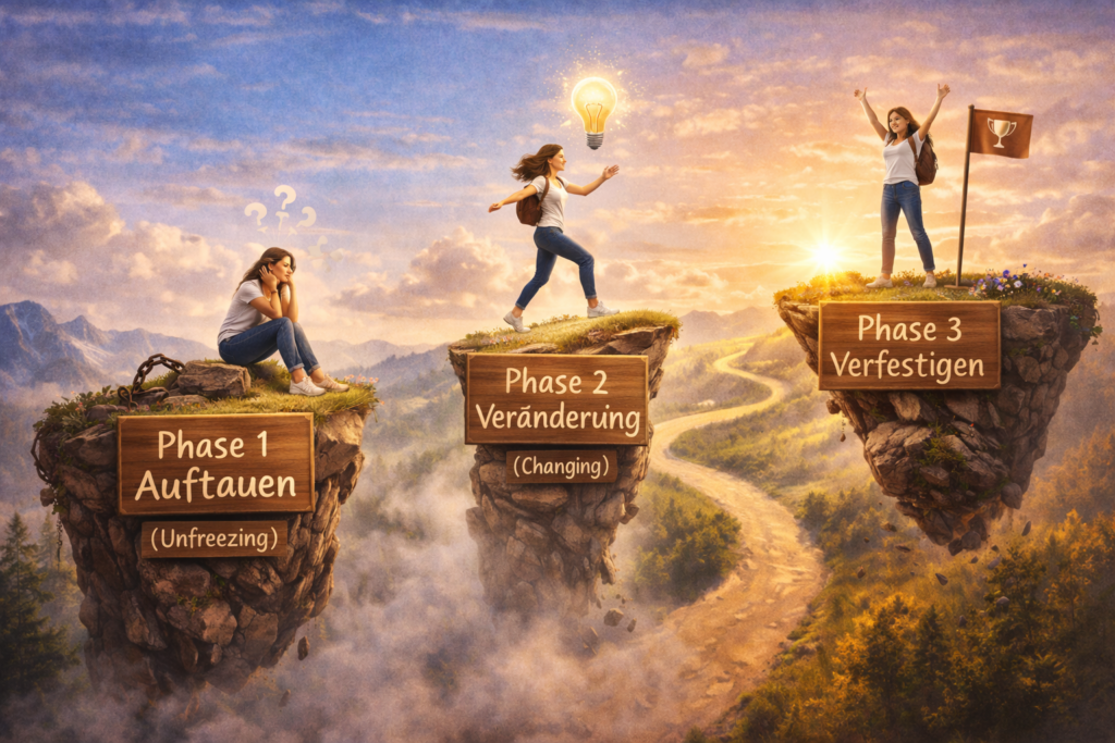 Veränderung ist kein einmaliger Schritt, sondern ein Prozess. Der Sozialpsychologe Kurt Lewin beschreibt ihn in drei Phasen: