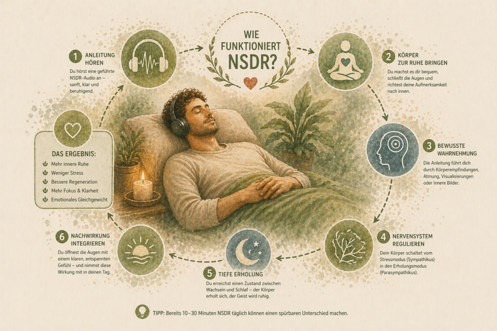 In diesem Beitrag erfährst du, was hinter NSDR steckt, warum diese Praxis so wirksam ist, und wie du sie auf eine unkomplizierte Weise in deinen Alltag integrieren kannst.