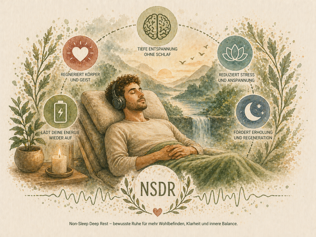 Hier setzt eine Methode an, die in den letzten Jahren zunehmend an Aufmerksamkeit gewonnen hat: Non-Sleep Deep Rest (NSDR). Eine Form der tiefen, bewussten Entspannung, die dem Nervensystem erlaubt, sich zu regulieren, ohne dass du dafür schlafen musst.